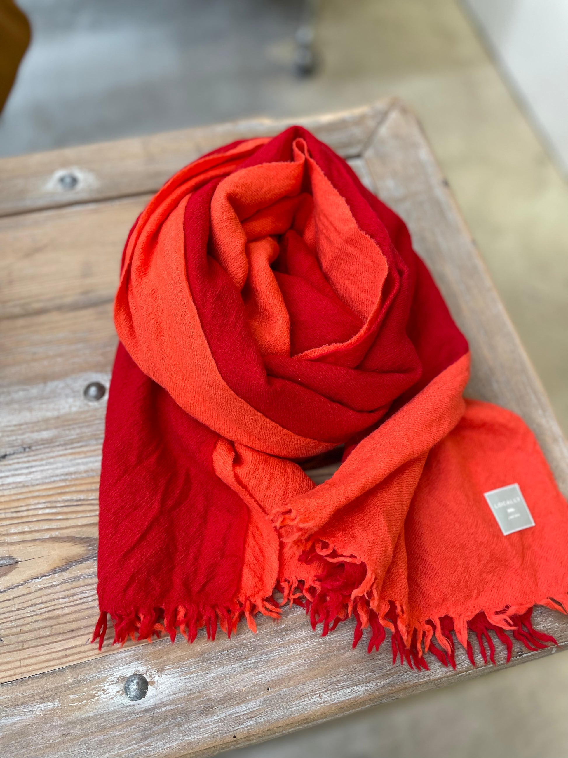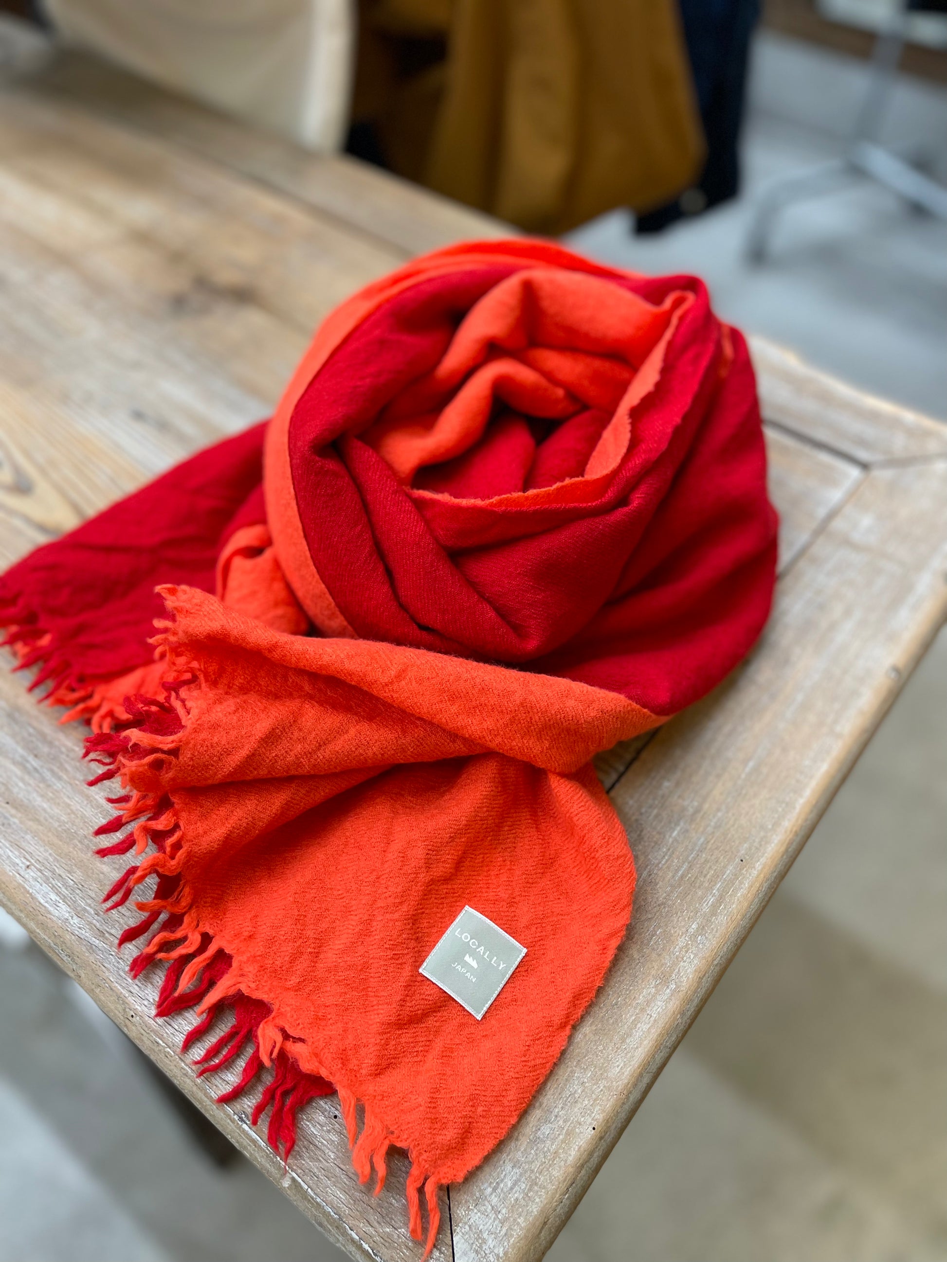 ウール素材の2色に切り替えしたマフラーです。尾州地域に残る旧式の織機であるションヘル式織機を使って織り上げています。この織機のゆっくり織り上げる特性から、他のものとは違う空気を含んだふっくらした生地の仕上がりになります。また洗い加工で縮絨させた生地は奥行ある表情を見せてくれます。自然なカジュアルスタイルからトラディショナルナルなスタイルまで幅広くお使い頂けます。一枚でもスタイル全体の雰囲気を変えられる特別なストールです。軽くてやさしい風合いが心地よく、冬の防寒には外せない一枚です。毎日巻きたくなるような仕上がりです。