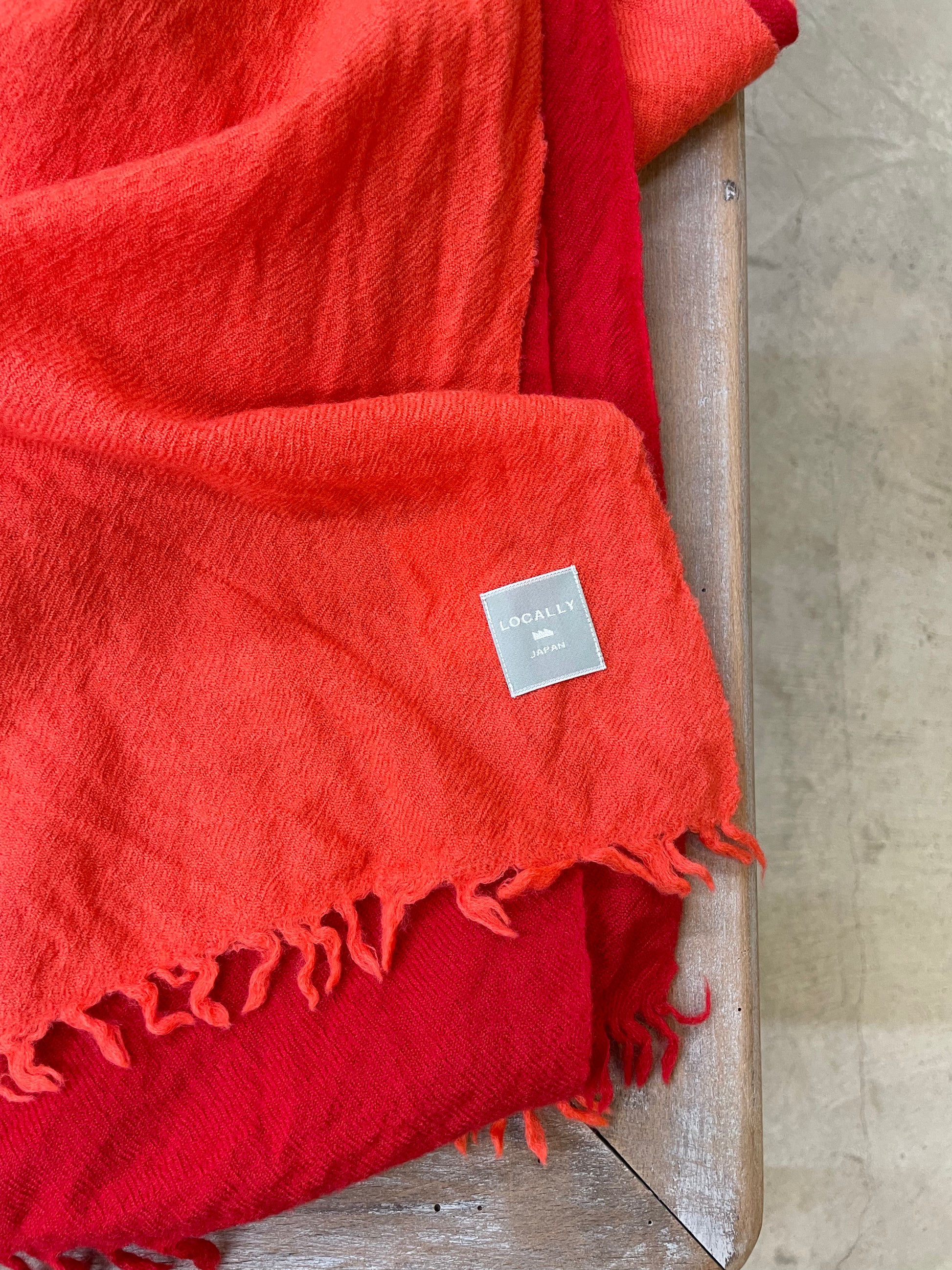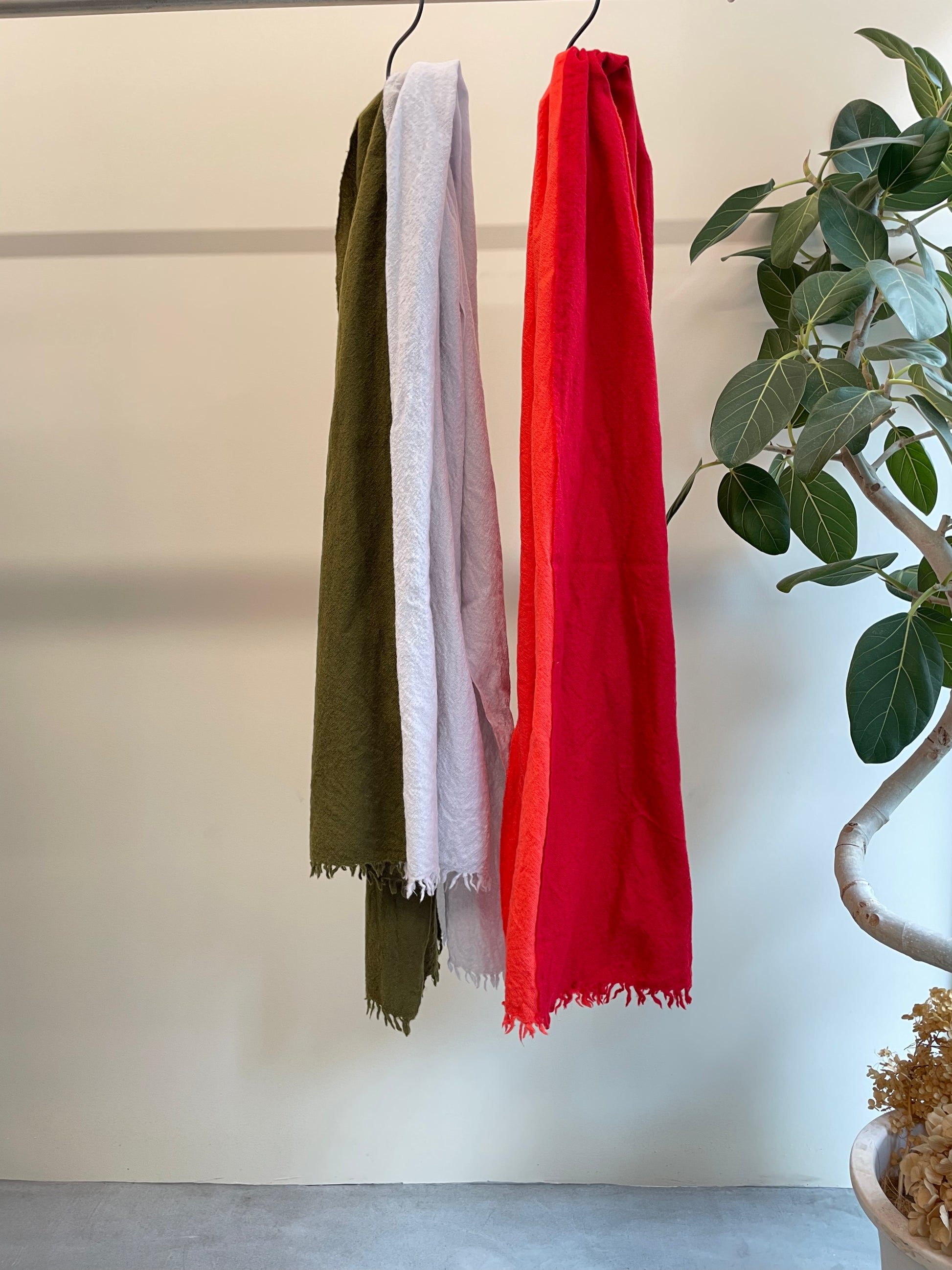 いろいろの巻き方や使い方ができる大きめのサイズです。作り手自らが洗い工程と自然な風合になるように仕上げ工程を行っています。短めのフリンジになった愛らしいディテールが手作業の雰囲気を存分に感じられます。防寒だけでなく室内でのひざ掛け等にお使い頂けます。コーディネートに取り入れるだけで秋冬のスタイルが決まる他にない雰囲気のマフラーです。