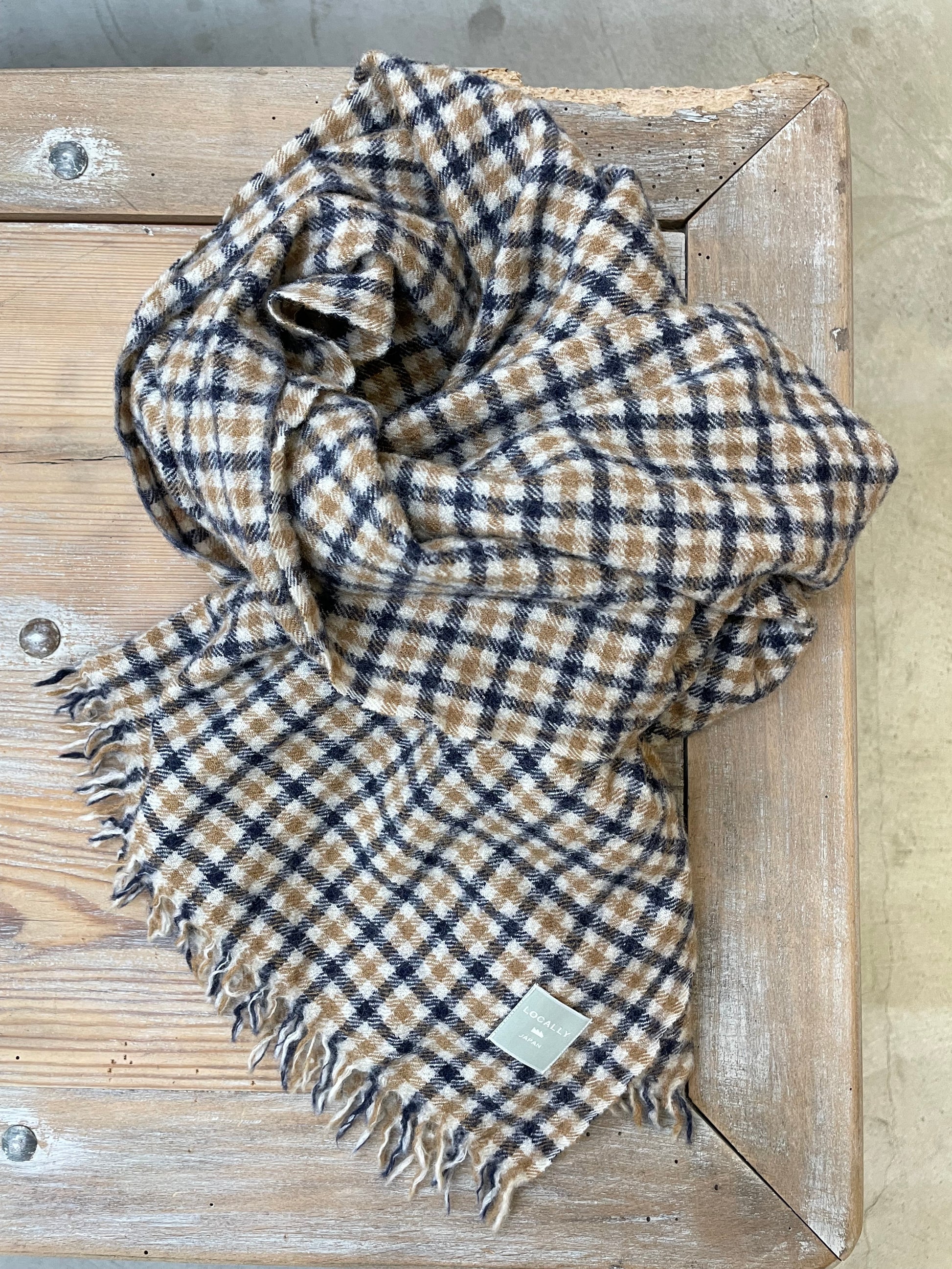 ウール素材のチェックストールです。尾州地域に残る旧式の織機であるションヘル式織機を使って織り上げています。この織機のゆっくり織り上げる特性から、他のものとは違う空気を含んだふっくらした生地の仕上がりになります。また洗い加工で縮絨させた生地は奥行ある表情を見せてくれます。自然なカジュアルスタイルからトラディショナルナルなスタイルまで幅広くお使い頂けます。一枚でもスタイル全体の雰囲気を変えられる特別なストールです。軽くてやさしい風合いが心地よく、冬の防寒には外せない一枚です。毎日巻きたくなるような仕上がりです。