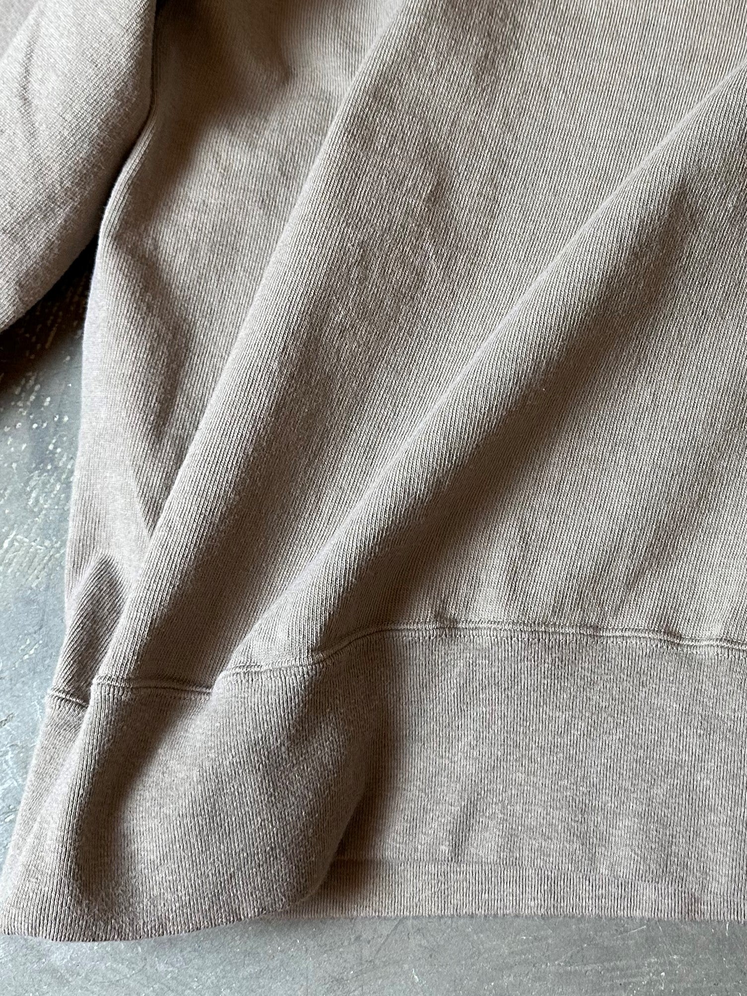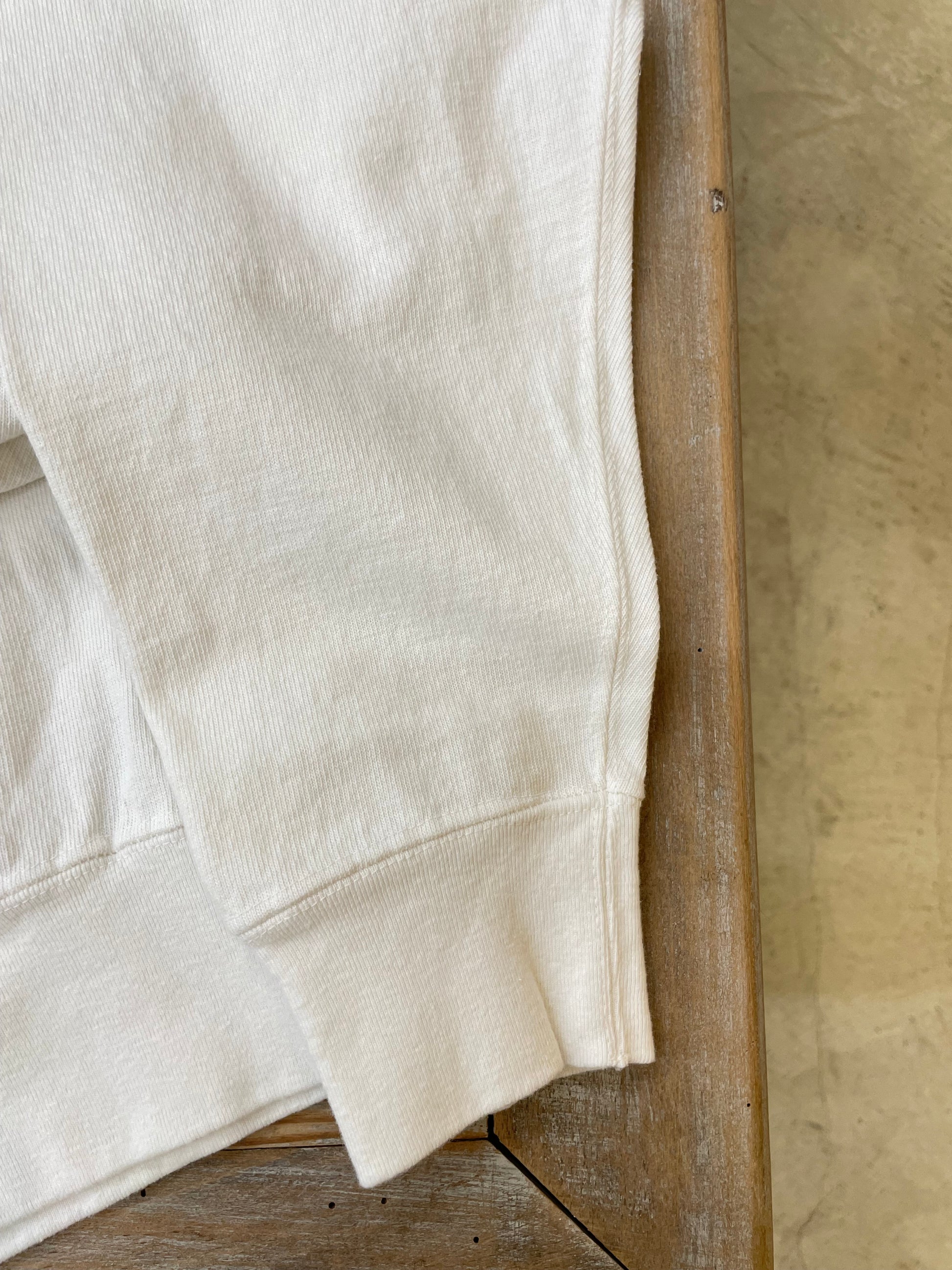 8番手の糸を使った目が詰まったしっかりとしたヘヴィーウエイトの天竺生地です。生産は和歌山市の旧式のシンカー編み機で行っています。サイドに剥ぎが無い丸胴に編みたてたクラシック感ある生地です。着込むほどにその風合いが増していきます。
