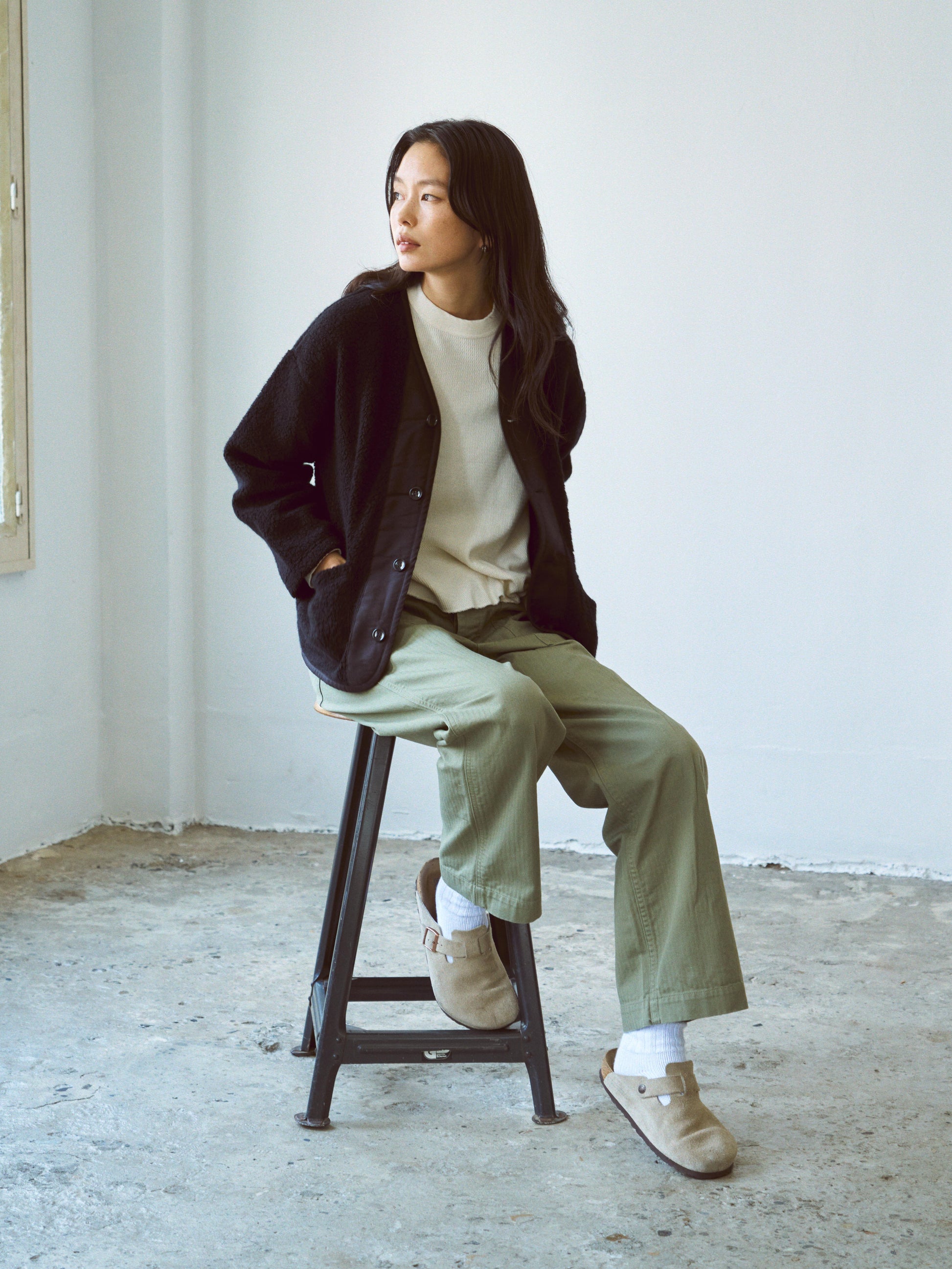 リサイクルウールを使うことで、通常ウールと比較すると81%も原材料を削減できるエシカルに繋がる生地です。ウールの産地尾州でニッティングされた生地になります。パイルは空気を含み暖かさがあります。ポリエステル、ナイロンを入れることで静電気を押さえ毛玉を出来づらくしています。ほど良い杢調の色目がウォーム感を出し秋冬のコーディネート幅を広げてくれます。