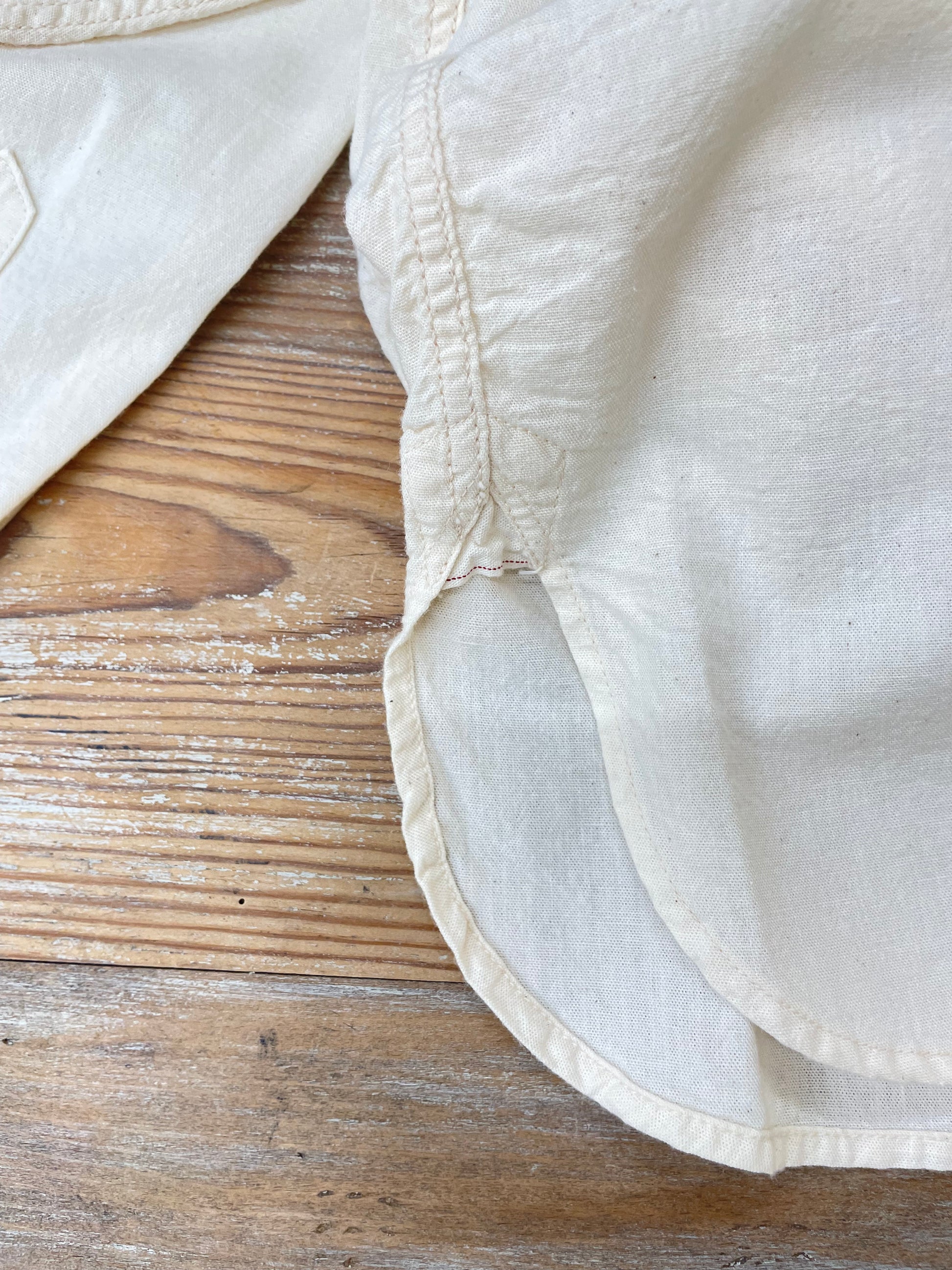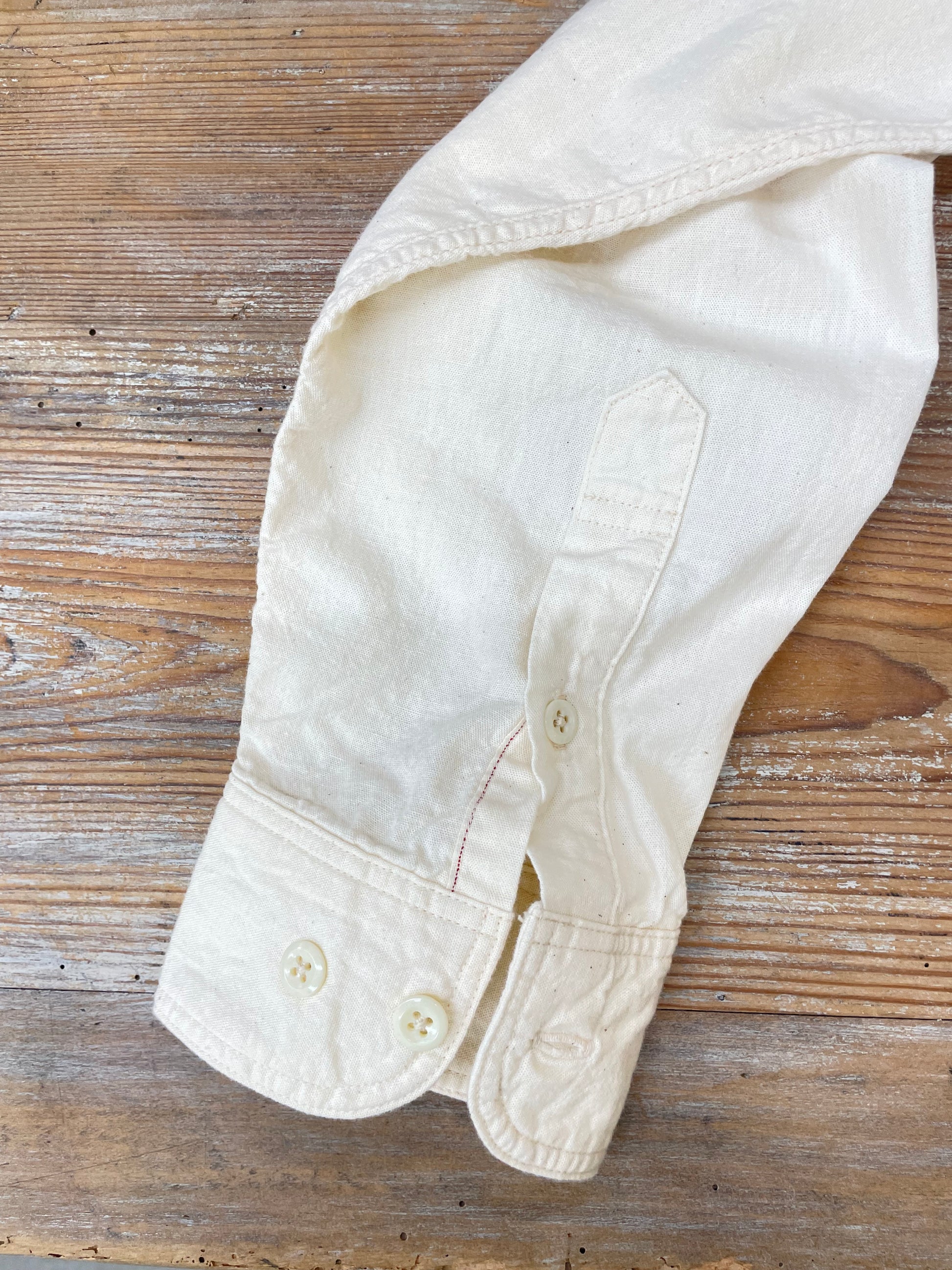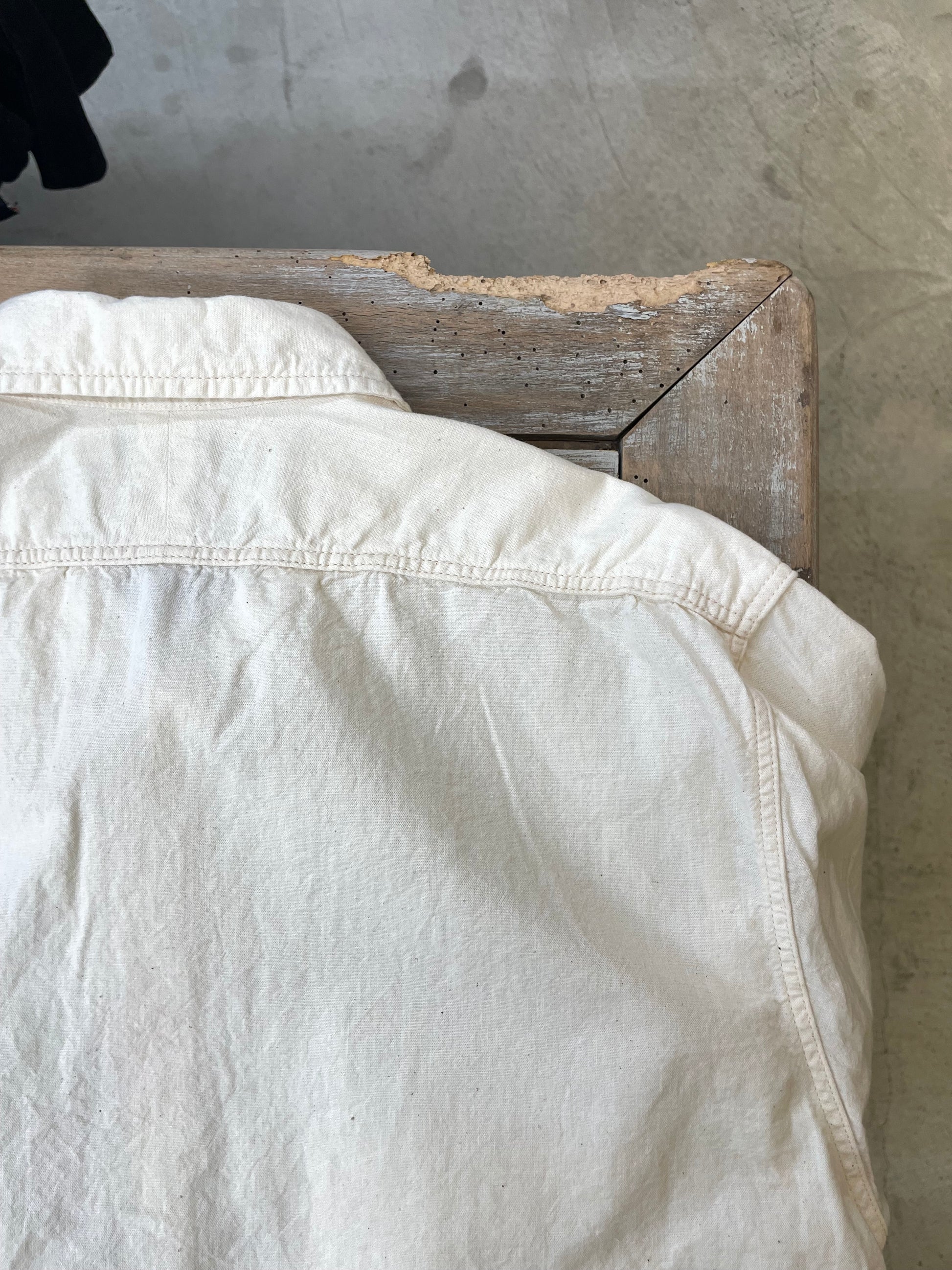 旧力織機で織り上げた縦緯生成り糸のセルヴィッチシャンブレー生地です。ヴィンテージワークウェアーのような粗野感ある表情です。着込むほどに馴染み経年変化を楽しめる生地です。生成り色はワークシャツながらジャケット等のインナーに使いやすい上品な着こなしもできる色目です。